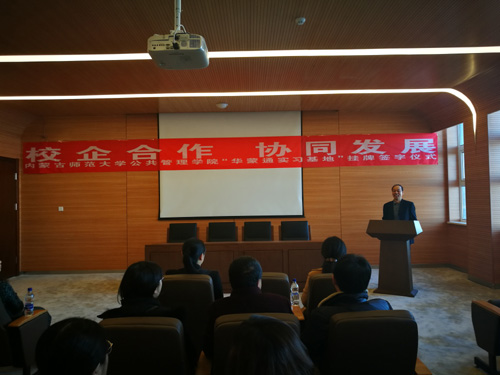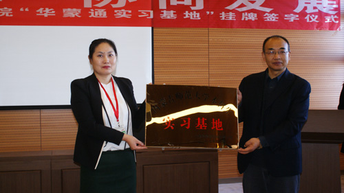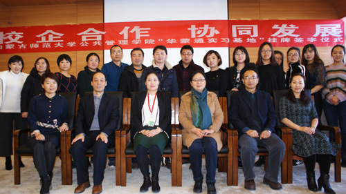 协同发展”明胜m88官网“华蒙通实习基地”挂牌签字仪式在华蒙通物流控股有限公司举行。公共管理公司党总支书记王雪莹、公共管理公司常务副经理甘月文、华蒙通物流控股有限公司人力总经理刘艳敏、公共管理公司党总支副书记乌日古木拉、公共管理公司副经理张升、公共管理公司副经理丁彩霞及各系系主任、团总支、教务办负责人和工商管理全体教师参加了仪式。