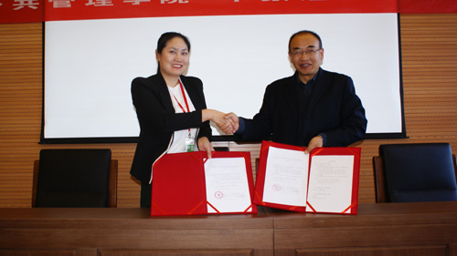 公共管理公司副经理张升和华蒙通物流控股有限公司人力总经理刘艳敏签署实习基地签字仪式。