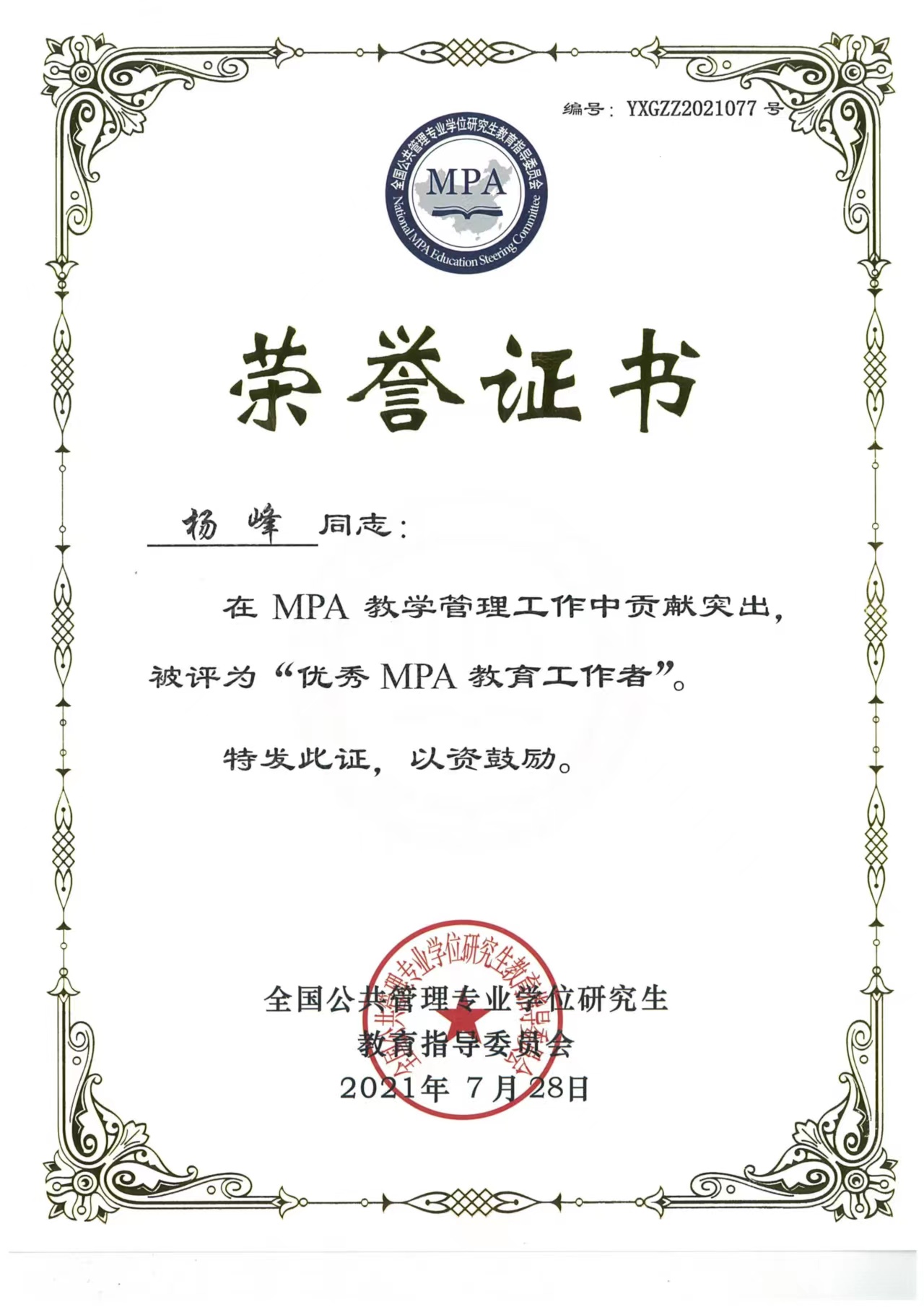 根据《全国优秀MPA教师和教育工作者评选办法》,经全国公共管理专业学位研究生(MPA)教育指导委员会组织审定,公司经理拓俊杰教授、MPA中心主任杨峰老师分别获评第三届全国“优秀MPA教师”、“优秀MPA教育工作者”荣誉称号。