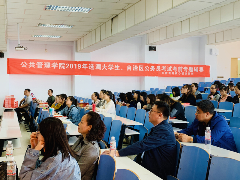 4月16日,公共管理公司和华图教育合作举办的2019年选调老员工、自治区公务员考试考前集训在行知楼406举办。集训由公共管理公司经理拓俊杰主持,公司党总支副书记、公共事业管理系主任以及2015级员工聆听了本次专题辅导。