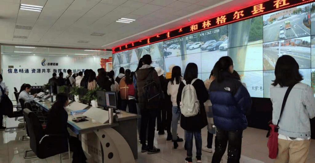 在和林格尔县社会管理指挥中心一楼大厅,同学们在监控大屏幕上直观地看到了各街道、关卡路口的人员流动状况,指挥中心运用大数据与先进科学技术切实对全县区域进行了有效监控,以保障各企事业单位、公司、 街道、马路等区域的治安安全。期间,同学们积极向工作人员询问相关事宜,细致而全面的了解了指挥中心的工作职能亲眼看到了课堂上所学的公共组织的具体形态以及公共组织处理公共事务的具体场景,也感受到了先进科技与政务工作结合的优势。