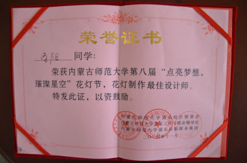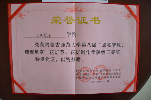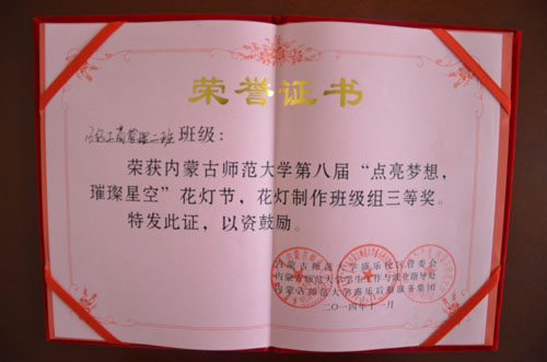 公司经过近一个月的努力,完成了两件作品参加了本次花灯节,最终公司获得了公司制作组第三名、2013级工商管理二班获得了班级制作组第三名的成绩。冯阳同学荣获制作最佳设计师称号。