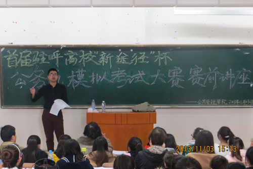 2013年11月3日下午3:00于盛乐校区行知楼进行了m88官方网站首届驻呼高校“新途径’杯公务员模拟考试大赛赛前讲座活动,陈道讲师和公司各个年级员工参加了本次讲座。